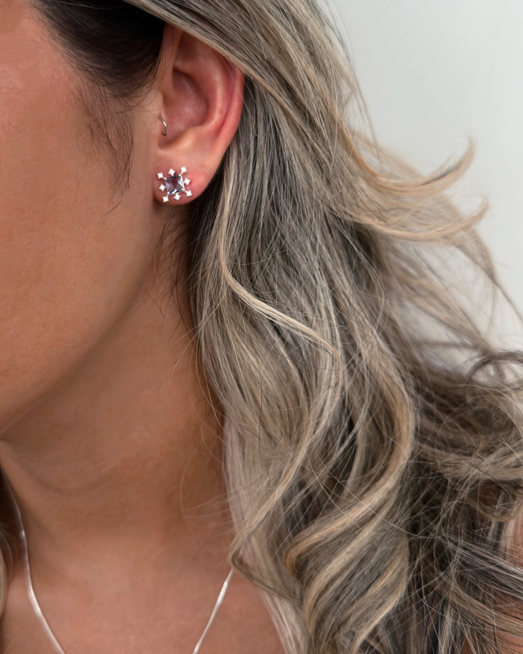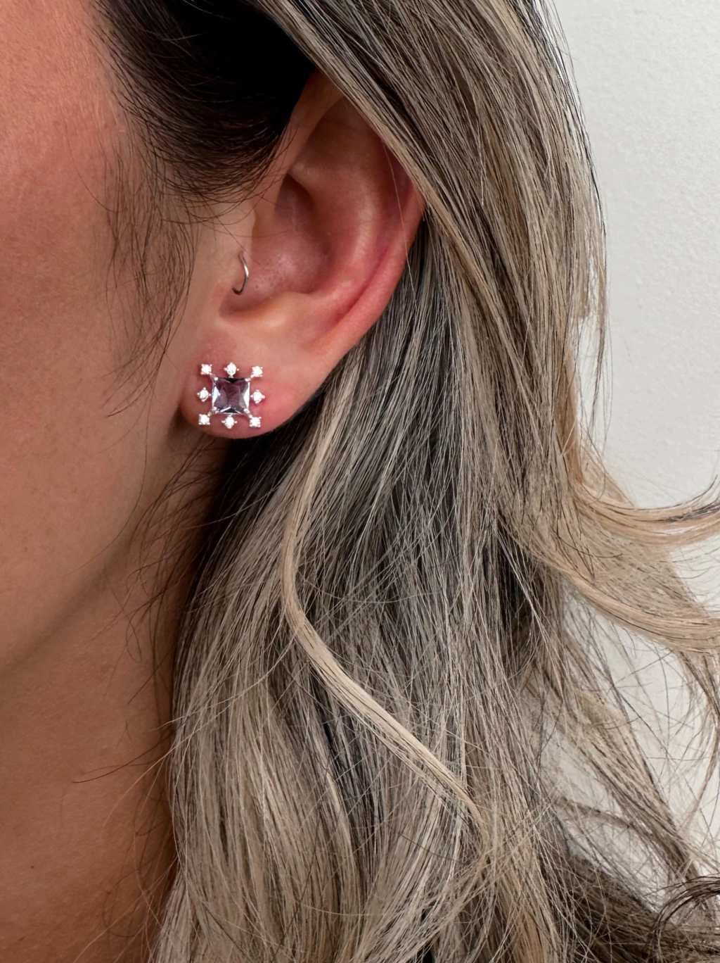Brinco zircônia quadrada Lilás - bordas cravejadas com zircônias - em Prata 925
