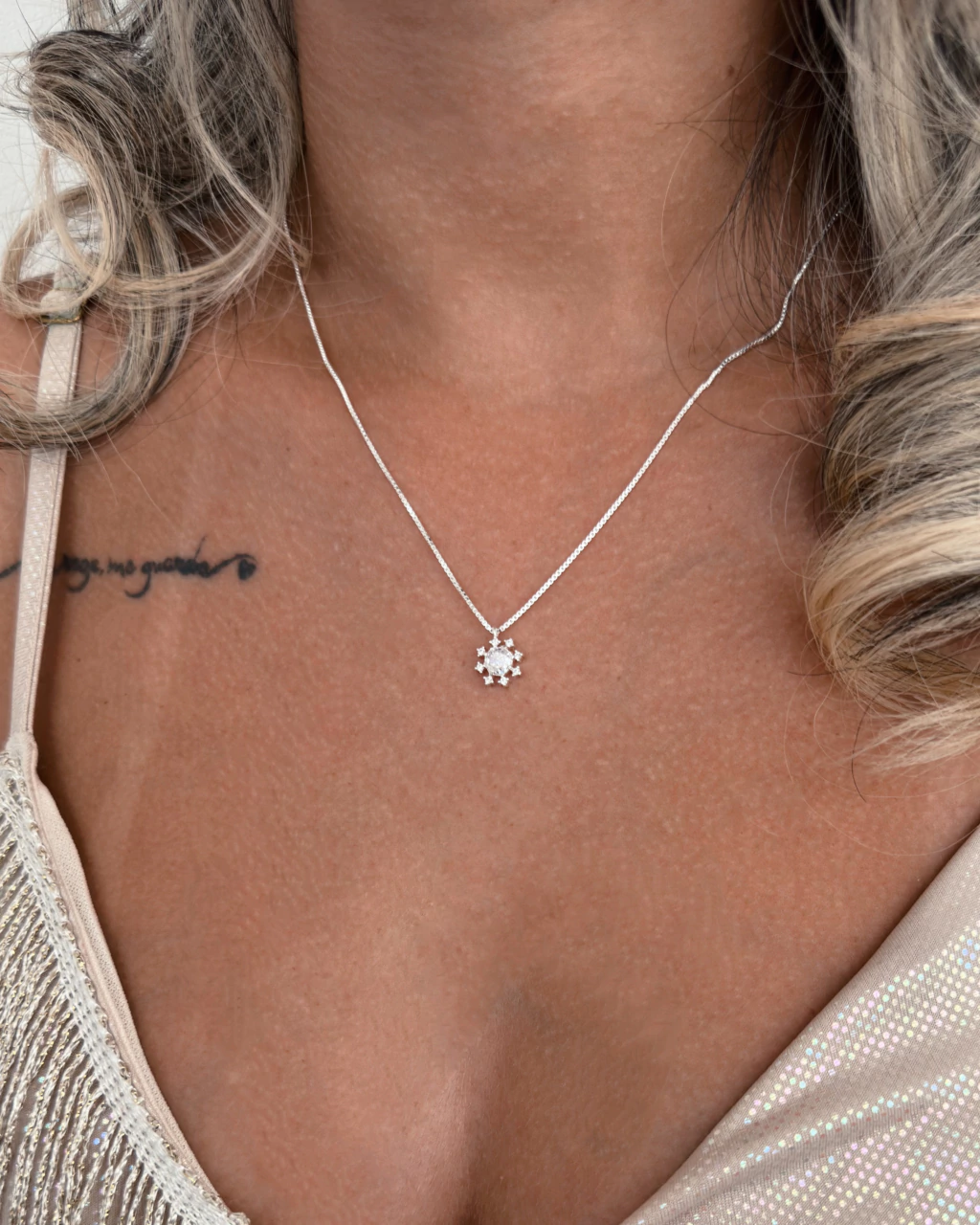 Colar floco de neve - zircônia redonda - com bordas cravejadas - em Prata 925