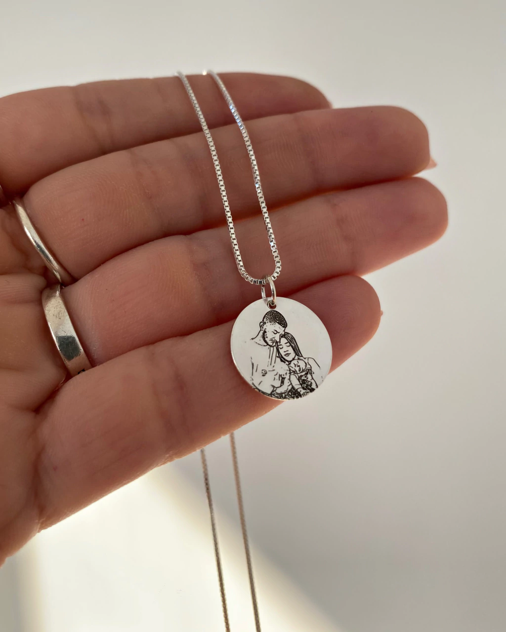 Nosso colar com pingente redondo de 1,5 cm, feito em Prata 925 legítima, pode ser personalizado com a foto de até 4 pessoas, gravada a laser em preto e branco, ou com escrita personalizada, como nomes, datas, frases curtas ou símbolos afetivos.